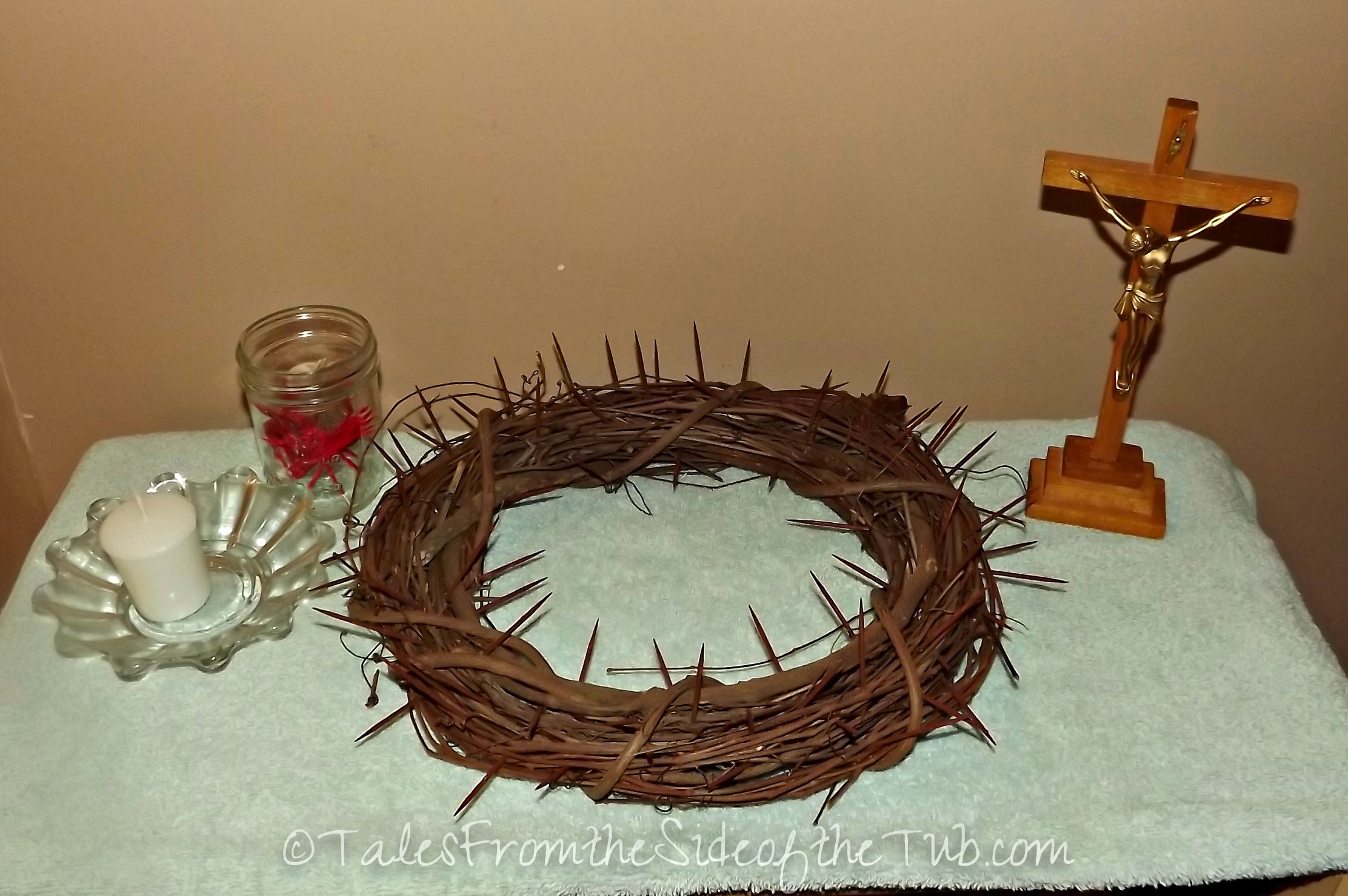Find a designated place for your crown of thorns. We made a small prayer table where we also included a crucifix and a candle.